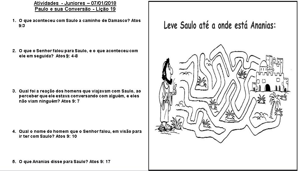11- Aplicação: Saulo era um perseguidor de cristãos, o seu desejo era prendê-los e até matá-los, mas um dia a bondade de Deus o alcançou e ele pode ver o grande amor de Deus através do seu filho Jesus, que o resgatou e o perdoou de todos os seus pecados, mudou seu coração e o seu nome para Paulo, para que ele fosse um grande pregador da Palavra de Deus. Assim o Senhor Jesus faz hoje na nossa vida quando nos arrependemos dos nossos pecados Ele nos perdoa e nos chama de seus filhos e nós devemos fazer como Paulo ensinar a Palavra de Deus a todas as pessoas.